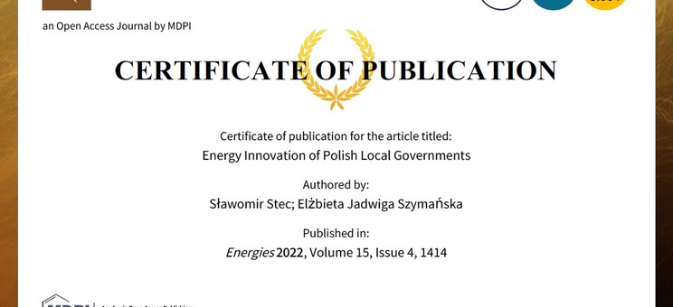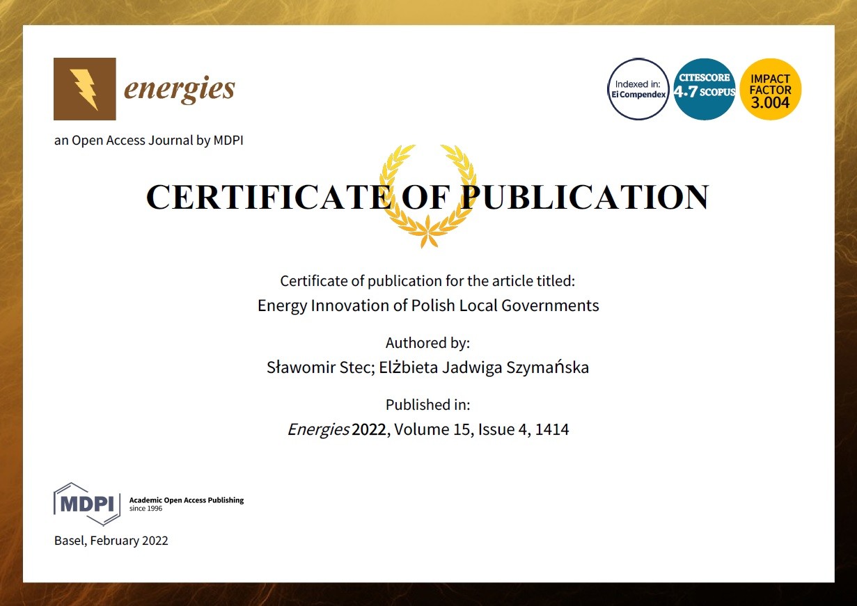 Stec S., Szymańska J. E. 2022. Energy innovation of Polish local governments. Policy and Economics Analysis of Renewable Energy Sources and Bioenergy - Energies MDPI - https://doi.org/10.3390/en15041414